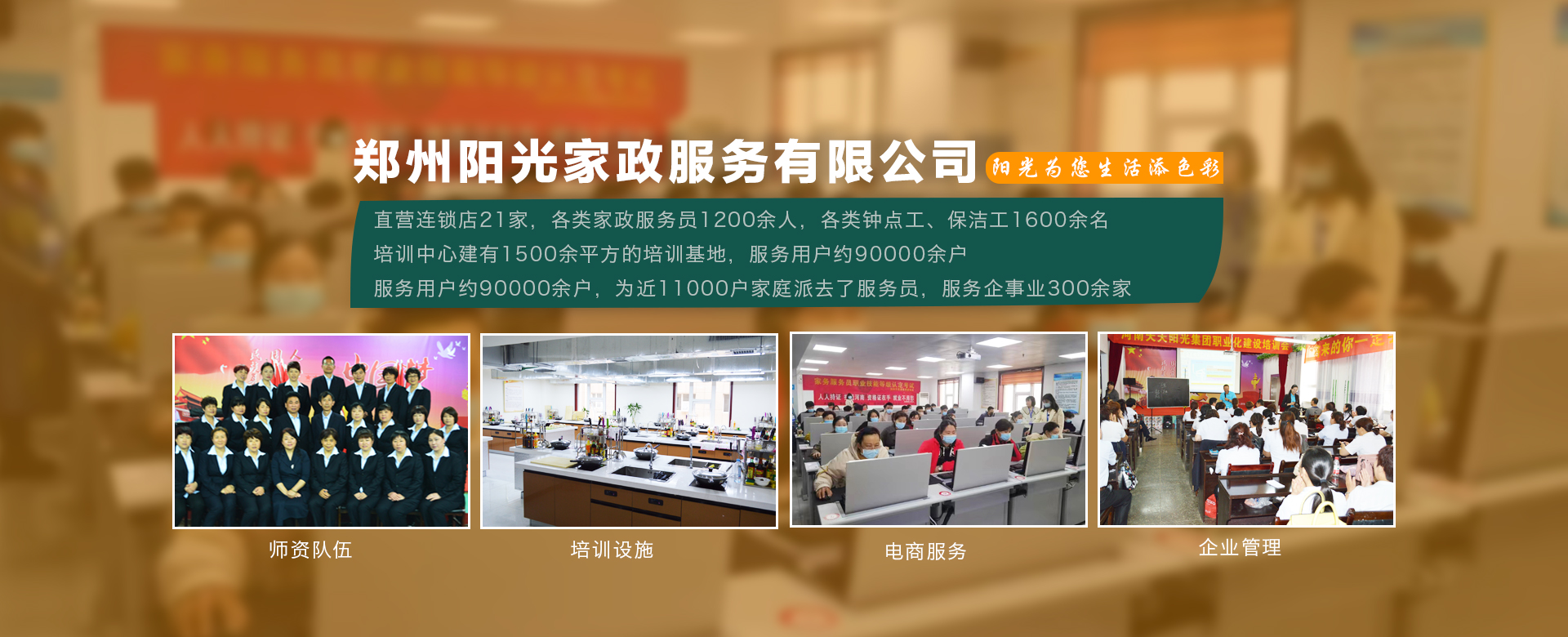 鄭州陽光家政服務有限公司成立于1998年,是鄭州市第 一家經工商登記的家政服務企業,是以家政服務、家政培訓、社區服務、社區養老、托幼護理、清洗保潔為一體的社區生活服務集成商。公司有直營連鎖店21家,各類家政服務員1200余人,各類鐘點工、保潔工1600余名。鄭州陽光家政商學院建有1500余平方的培訓基地,···